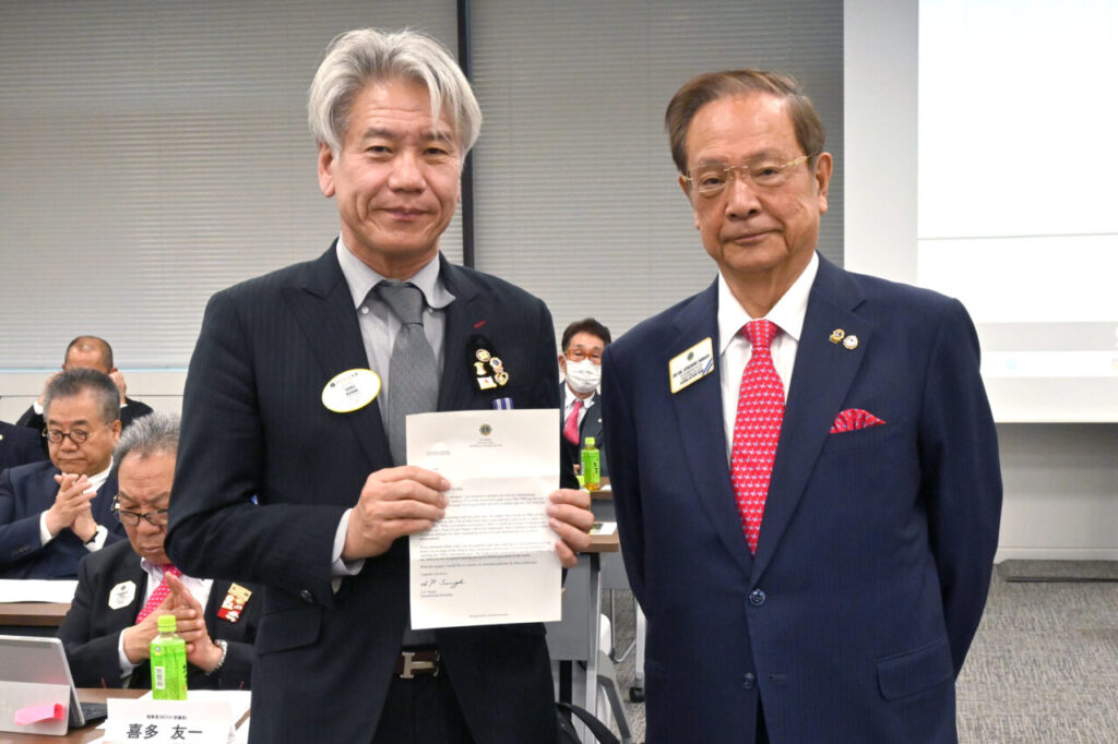 報告の前にはミッション1.5会員拡大勧誘目標に対して75%を達成した地区ガバナーに対して表彰が行われ、334-A地区 速水ガバナー・334-D地区 森川ガバナー・336-D地区 日下ガバナーの三名に山田元国際会長より会長メダルが手渡されました。